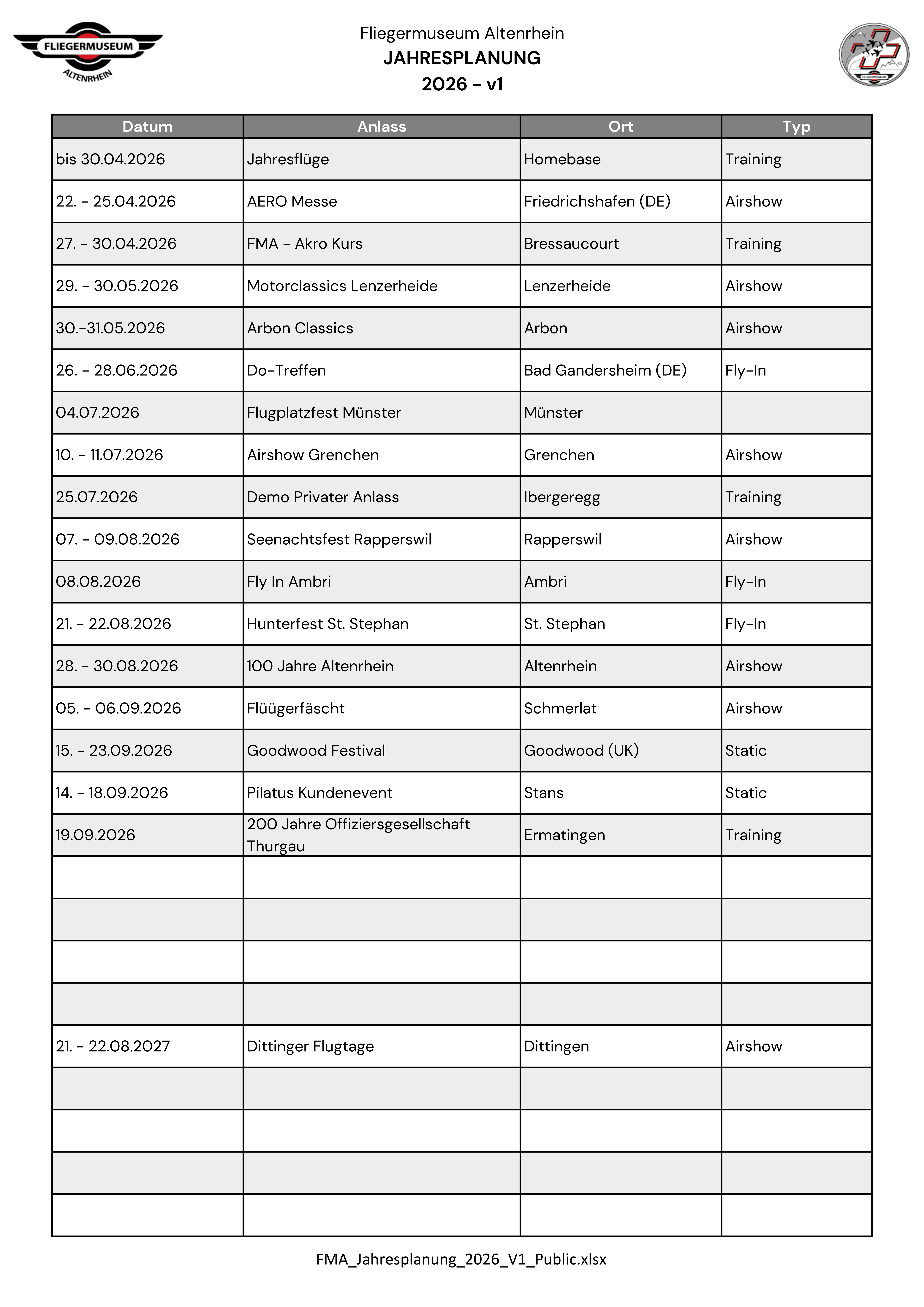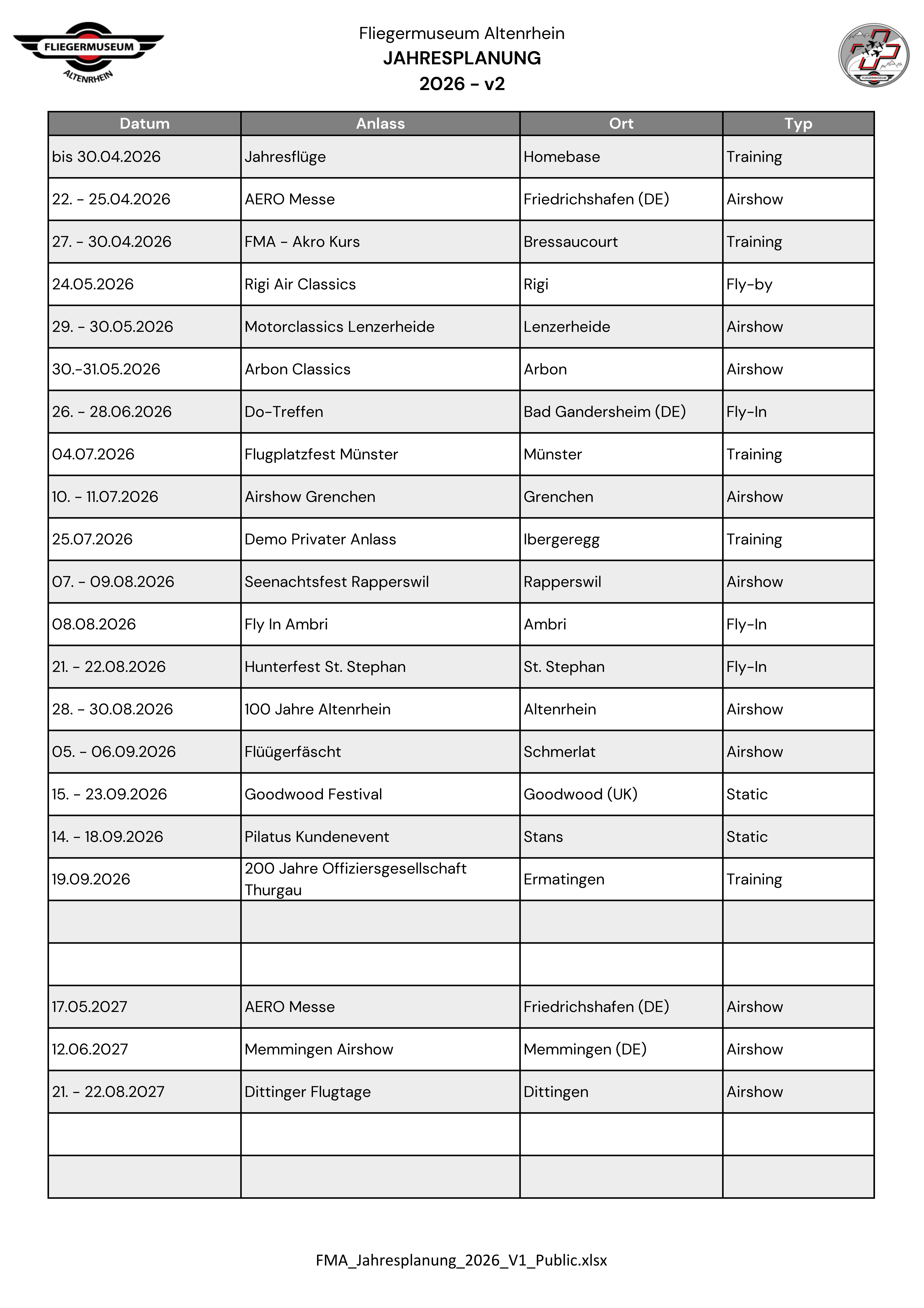 Events 2026 mit Teilnahme und/oder Organisation des FMA